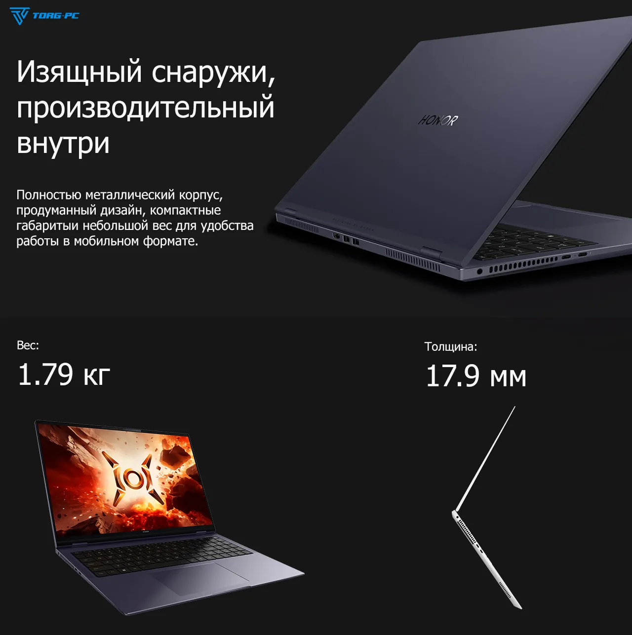 Тонкий, легкий (всего **1,8 кг**) и стильный – HONOR MagicBook Pro 16 создан для тех, кто ценит скорость, комфорт и безупречный дизайн. Покоряйте новые вершины с технологиями будущего уже сегодня!