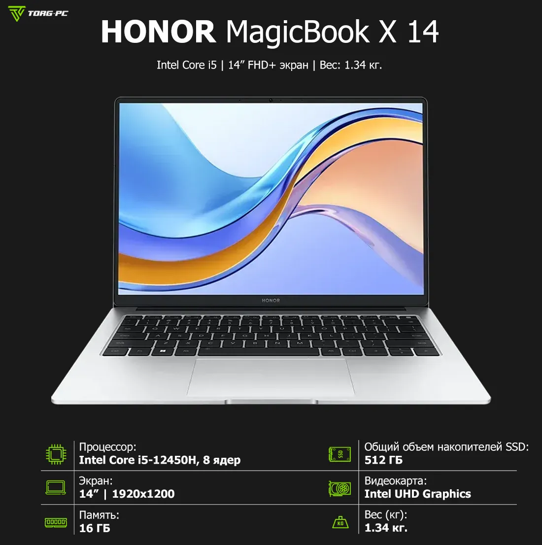 Ноутбук HONOR MagicBook X 14 (Core i5-12450H 8-ядерный 2.0-4.4Ghz/14" 1920х1200 IPS Антибликовое 300nit/RAM 16Gb LPDDR4x, 4266GHz/512Gb SSD (Количество разъемов SSD M.2-2шт)/Win 11 Home/Подсветка клавиатуры/Сканер отпечатка)