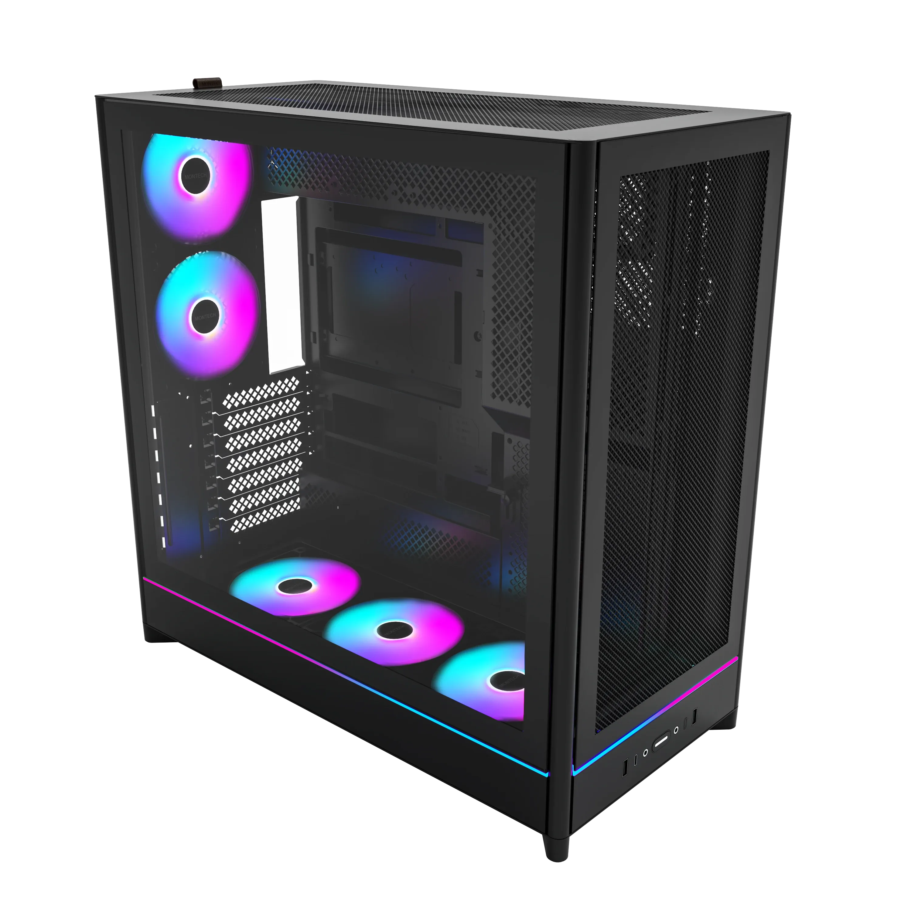 Планируете сборку с мощным охлаждением и несколькими видеокартами? Корпус Montech форм-фактора Midi-Tower с поддержкой плат ATX вмещает видеокарты длиной до 420.0 мм, предоставляя простор для установки массивных систем охлаждения, нескольких накопителей и аккуратной прокладки кабелей. В комплекте 5 x 120 мм вентиляторов для эффективного охлаждения компонентов. Боковая панель с окном демонстрирует внутреннее содержимое сборки. Подсветка ARGB добавит индивидуальности и синхронизируется с остальными компонентами. Продуманная система управления кабелями обеспечивает чистоту сборки и улучшает циркуляцию воздуха. Раскройте потенциал охлаждения — температуры под контролем!